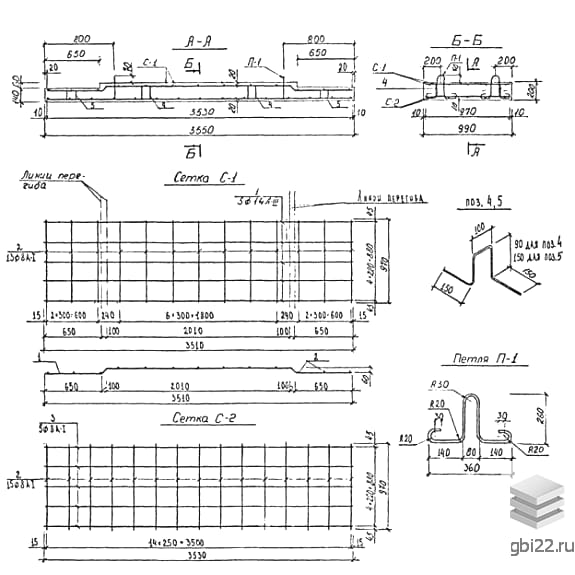Плита представляет собой монолитный железобетонный элемент, изготовленный из тяжелого бетона марки М300 и выше. Армирование выполнено сварным каркасом из стальной арматуры классов АI или АIII, что обеспечивает повышенную прочность.