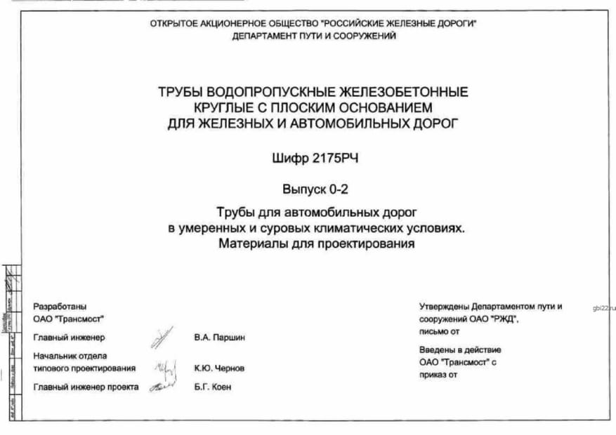 | Название стандарта | Трубы водопропускные железобетонные круглые с плоским основанием для железных и автомобильных дорог. |
