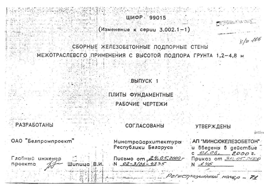 | Название стандарта | Сборные железобетонные подпорные стены межотрослевого применения с высотой подпора грунта 1,2-4,8м. |