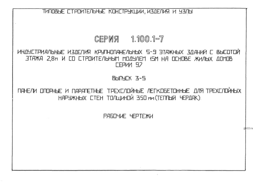 | Название стандарта | Индустриальные изделия крупнопанельных 5 – 9 этажных зданий с высотой этажа 2,8 м и со строительным модулем 15 м на основе жилых домов серии 97. Выпуск 0. Состав серии. Материалы для проектирования. |