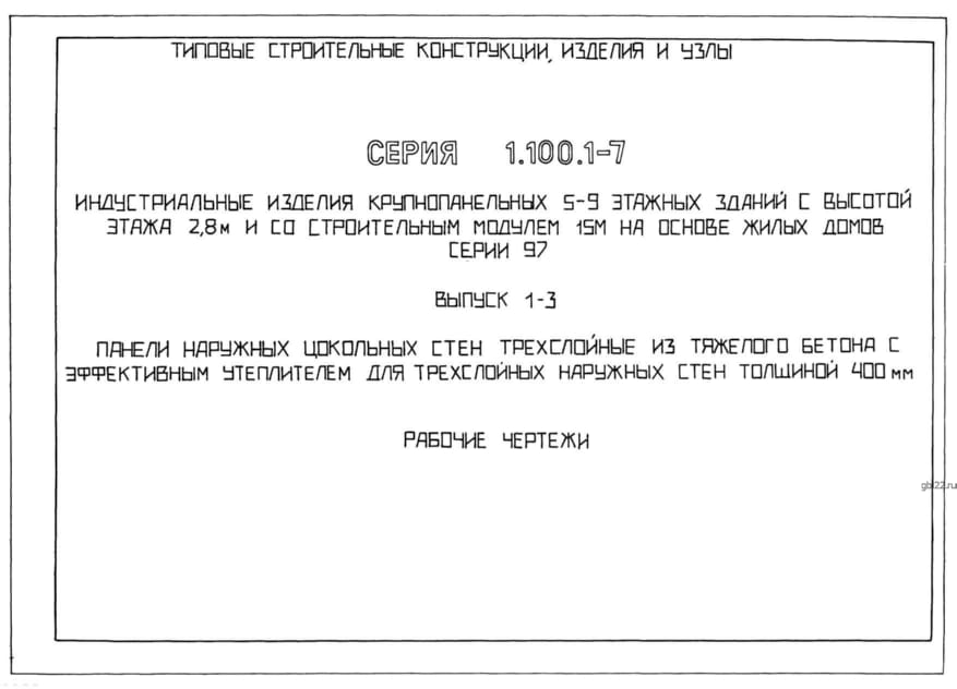 | Название стандарта | Индустриальные изделия крупнопанельных 5 – 9 этажных зданий с высотой этажа 2,8 м и со строительным модулем 15 м на основе жилых домов серии 97. Выпуск 0. Состав серии. Материалы для проектирования. |