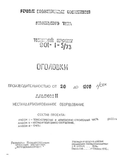 | Название стандарта | Речные водозаборные сооружения раздельного типа. Оголовки производительностью от 20 до 1000 л/сек. |