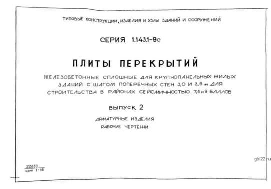 | Название стандарта | Плиты перекрытий железобетонные сплошные для крупнопанельных жилых зданий с шагом поперечных стен 3,0 и 3,6 м для строительства в районах сейсмичностью 7, 8 и 9 баллов. |