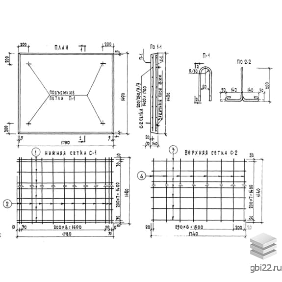 Армирование выполняется с использованием сваренных контактной точечной сваркой плоских сеток. В качестве рабочей арматуры применяется проволока класса Вр-1 по ГОСТ 6727-53, что придает плите необходимую прочность. Для подъемных петель используется стержневая сталь гладкого профиля класса AI по ГОСТ 5781-61. На верхней грани плиты обязательно наносится знак «В», указывающий на верхнюю сторону. Плоскость, отмеченная знаком, должна быть ровной и гладкой, готовой к покраске.