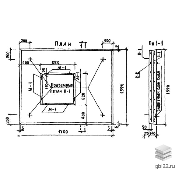 Плита имеет прямоугольную форму и оснащена четырьмя подъемными петлями. В конструкции здания данное изделие опирается на несущие элементы. Несмотря на относительно небольшой вес, плита способна выдерживать нагрузки от сооружения. Рабочие чертежи изделия содержатся в Серии 86.