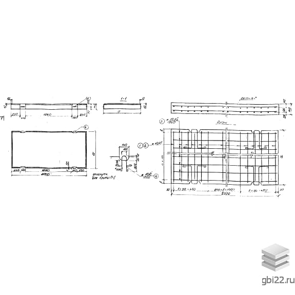 Плиты покрытия П 1 (ИНВ 28900м) представляют собой высокопрочные железобетонные строительные элементы. Они имеют прямоугольную форму и оснащены овальными углублениями на продольных и торцевых гранях, в которых размещаются строповочные петли. Эти петли необходимы для упрощения монтажа и выполнения погрузочно-разгрузочных операций.