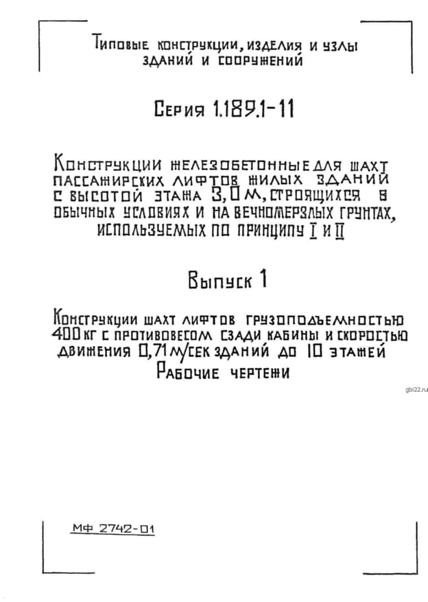 | Название стандарта | Конструкции железобетонные для шахт пассажирских лифтов жилых зданий с высотой этажа 3,0 м, строящихся в обычных условиях и на вечномерзлых грунтах, используемых по принципу I и II. |