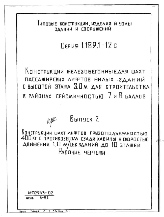 | Название стандарта | Конструкции железобетонные для шахт пассажирских лифтов жилых зданий с высотой этажа 3,0 м для строительства в районах сейсмичностью 7 и 8 баллов. |