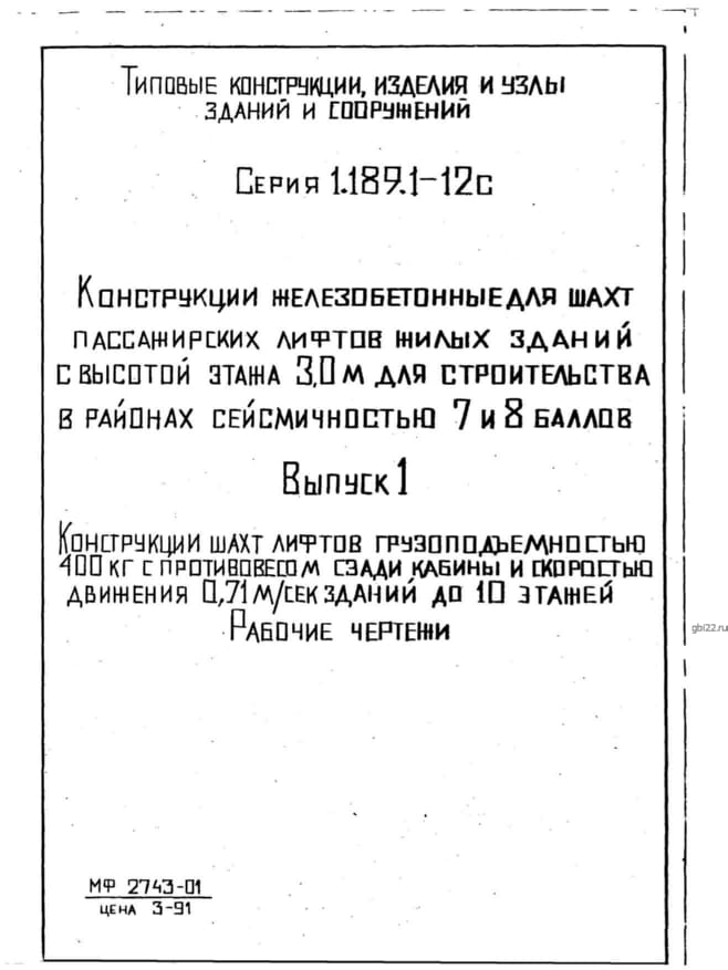 | Название стандарта | Конструкции железобетонные для шахт пассажирских лифтов жилых зданий с высотой этажа 3,0 м для строительства в районах сейсмичностью 7 и 8 баллов. |