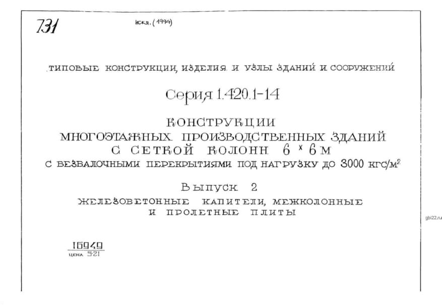 | Название стандарта | Конструкции многоэтажных производственных зданий с сеткой колонн 6х6 м с безбалочными перекрытиями под нагрузку до 3000 кгс/кв. м. |