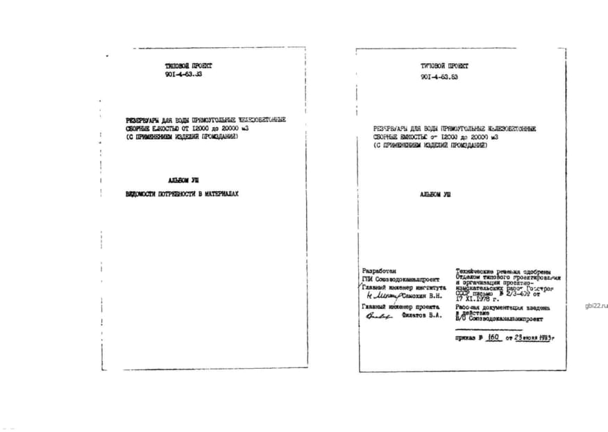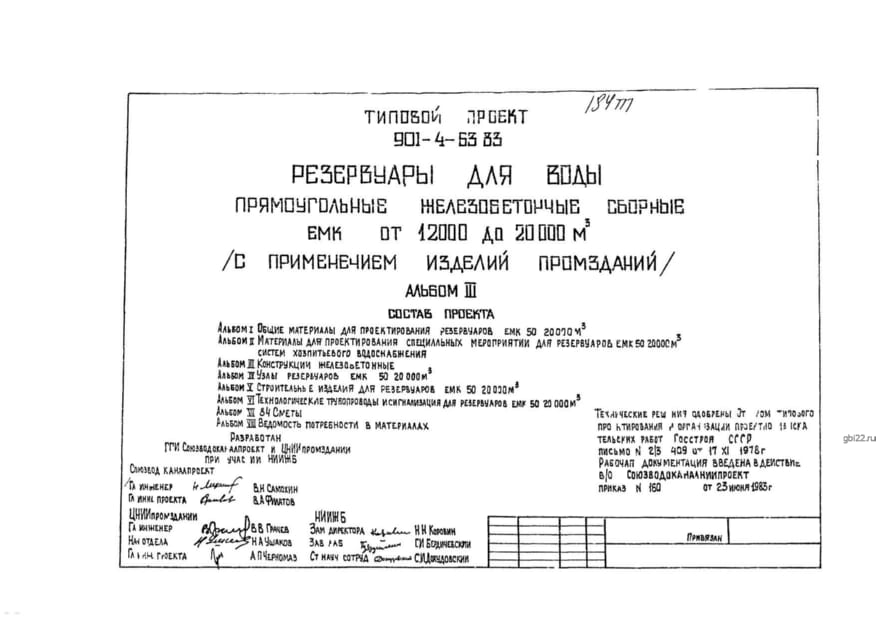 | Название стандарта | Резервуары для воды прямоугольные железобетонные сборные емкостью от 12000 до 20000 м3 (с применением изделий промзданий). |