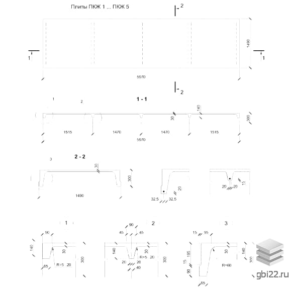 Ребристая плита ПКЖ 3 (по стандарту ГОСТ 7740-55) представляет собой высокопрочную железобетонную конструкцию в форме буквы "П". На поверхности плиты расположены поперечные и продольные ребра жесткости, которые позволяют изделию выдерживать значительные нагрузки. Поля между ребрами образуют плоскую армированную полку.