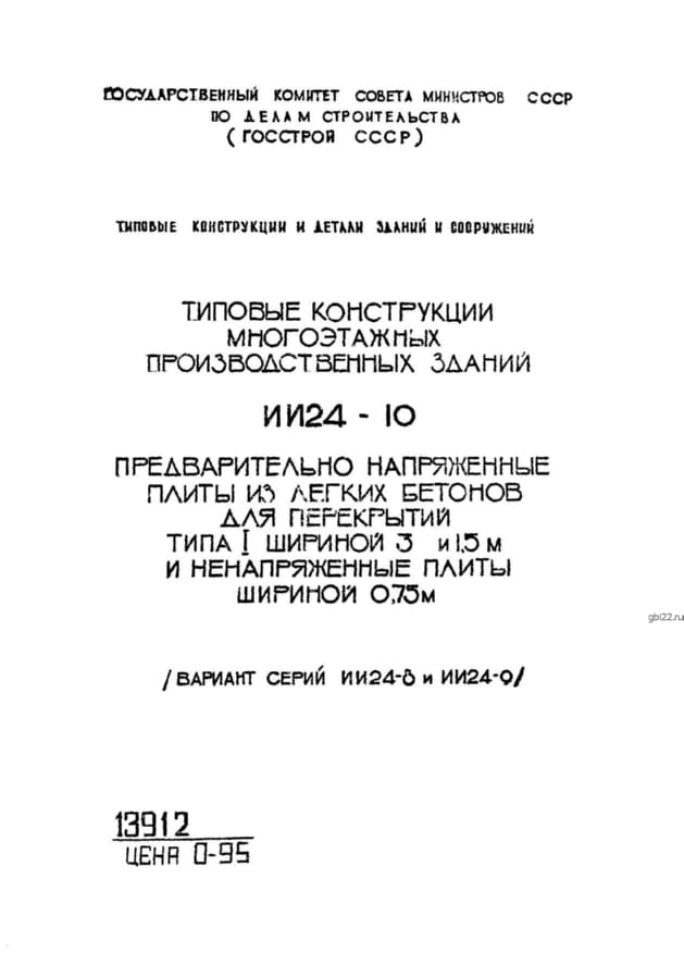 | Название стандарта | Предварительно напряженные плиты из легких бетонов для перекрытий типа 1 шириной 3 и 1,5 м и ненапряженные плиты шириной 0,75 м (вариант серий ИИ24-8 и ИИ24-9). |