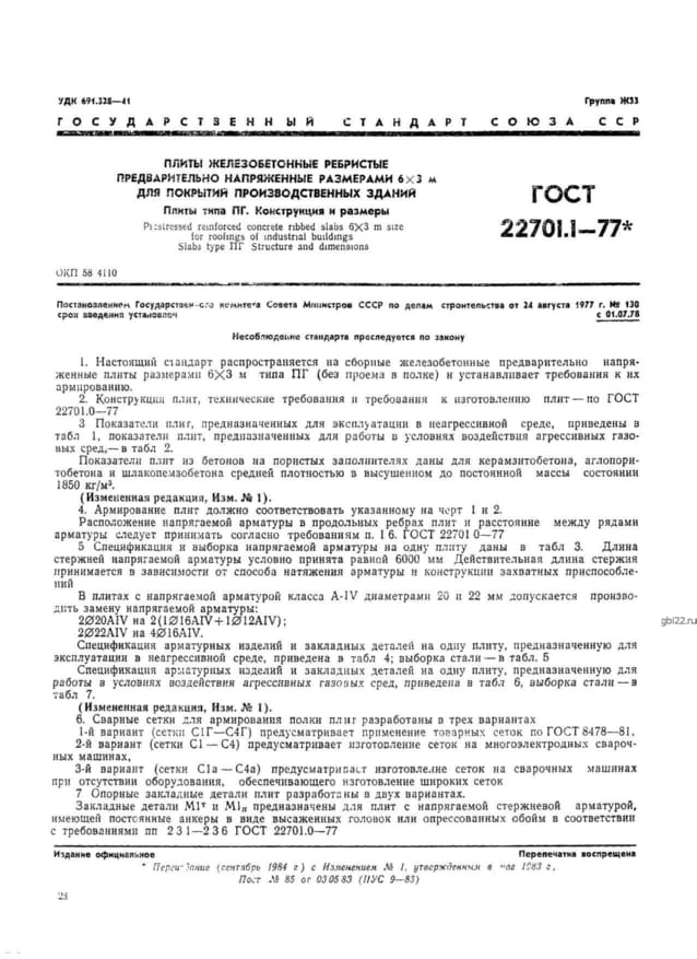 | Название стандарта | Плиты железобетонные ребристые предварительно напряженные размерами 6х3 м для покрытий производственных зданий. Технические условия. |