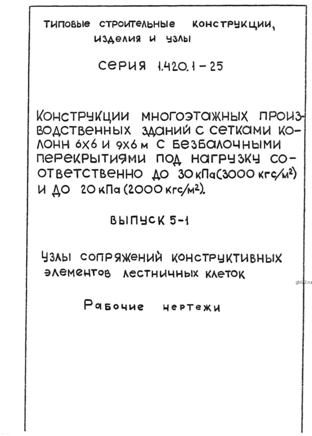 | Название стандарта | Конструкции многоэтажных производственных зданий с сетками колонн 6х6 и 9х6 м с безбалочными перекрытиями под нагрузку соответственно до 30 кПа (3000 кгс/кв.м) и до 20 кПа (2000 кгс/кв.м). |