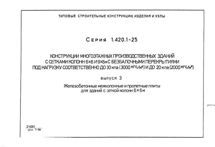 | Название стандарта | Конструкции многоэтажных производственных зданий с сетками колонн 6х6 и 9х6 м с безбалочными перекрытиями под нагрузку соответственно до 30 кПа (3000 кгс/кв.м) и до 20 кПа (2000 кгс/кв.м). |