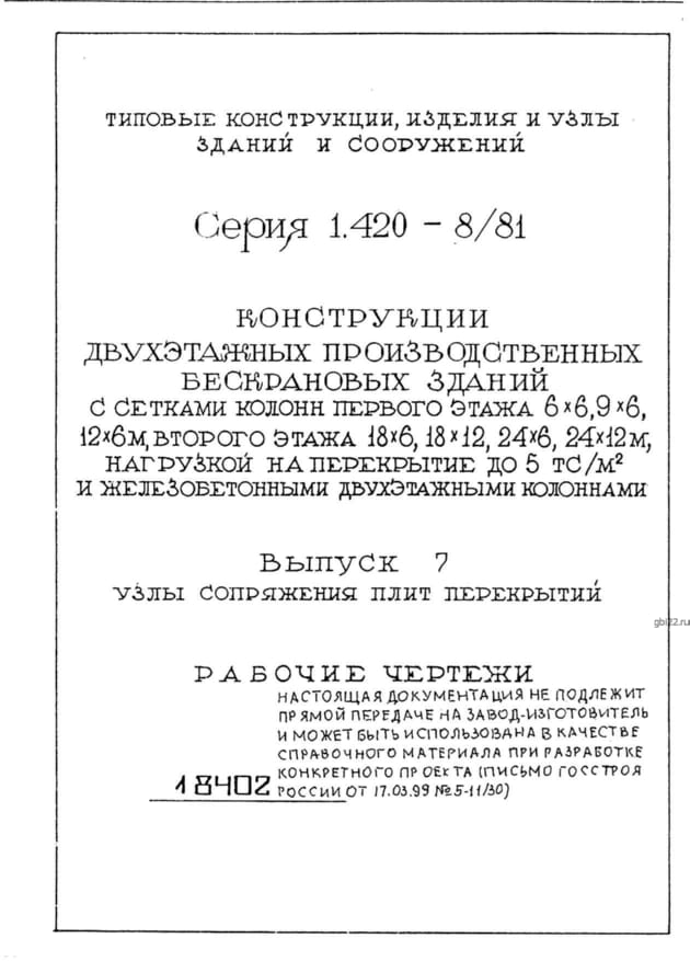 | Название стандарта | Конструкции двухэтажных производственных бескрановых зданий с сетками колонн первого этажа 6х6, 9х6, 12х6 м, второго этажа 18х6, 18х12, 24х6, 24х12 м, нагрузкой на перекрытие до 5 тс/м2 и железобетонными двухэтажными колоннами. |