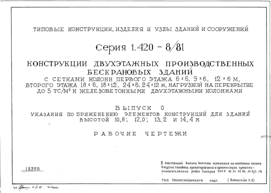 | Название стандарта | Конструкции двухэтажных производственных бескрановых зданий с сетками колонн первого этажа 6х6, 9х6, 12х6 м, второго этажа 18х6, 18х12, 24х6, 24х12 м, нагрузкой на перекрытие до 5 тс/м2 и железобетонными двухэтажными колоннами. |