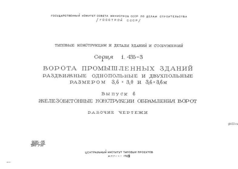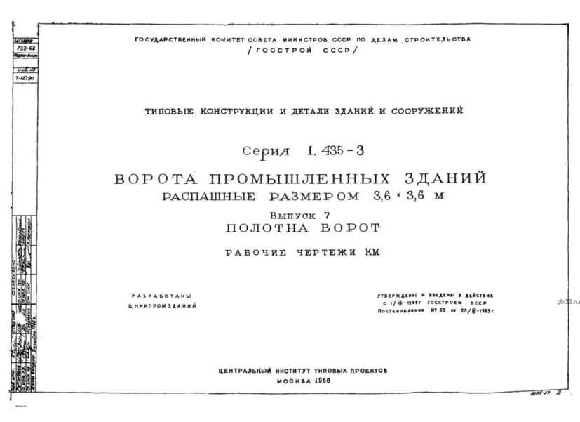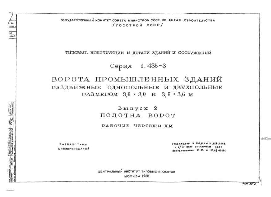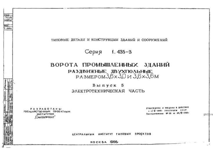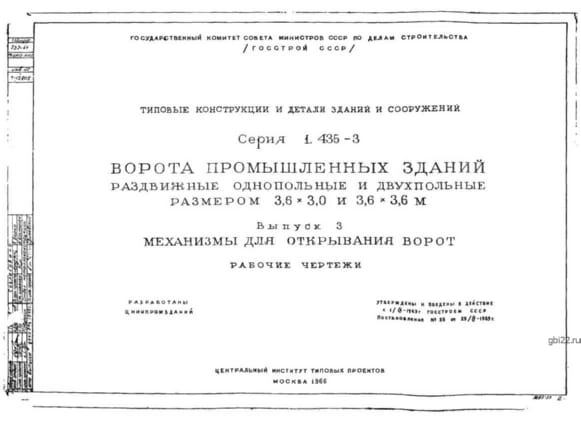 | Название стандарта | Ворота промышленных зданий раздвижные однопольные и двухпольные размером 3,6х3,0 и 3,6х3,6 м, распашные размером 3,6х3,6 м. |