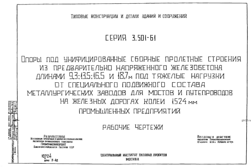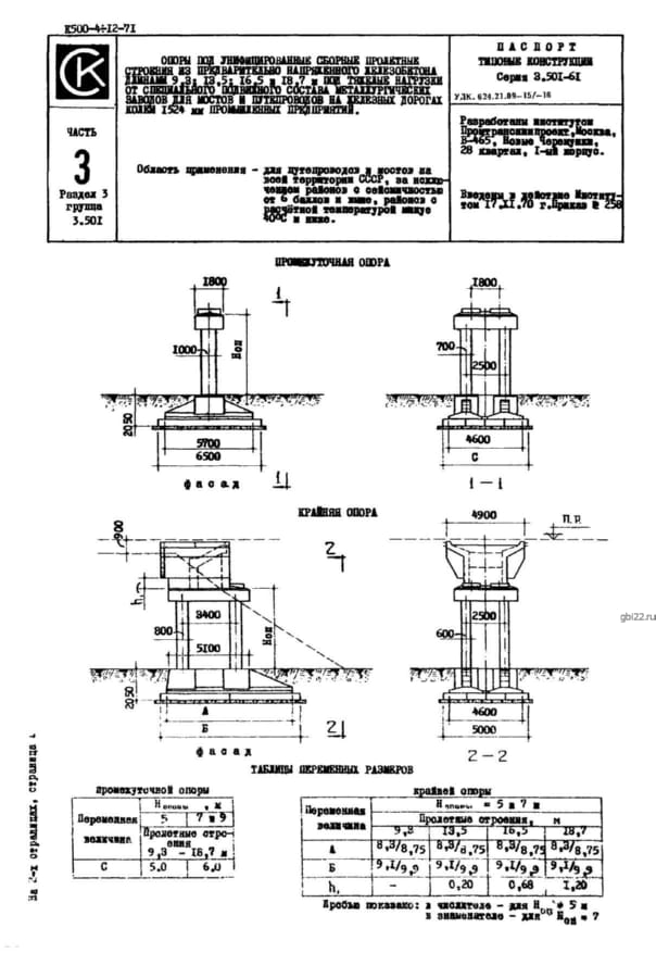 | Название стандарта | Опоры под унифицированные сборные пролетные строения из предварительно напряженного железобетона длинами 9,3; 13,5; 16,5 и 18,7 м под тяжелые нагрузки от специального подвижного состава металлургических заводов, для мостов и путепроводов на железных дорог |