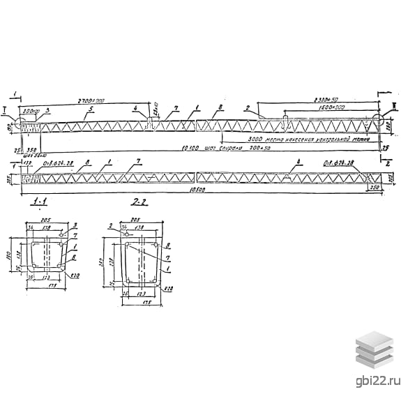 Железобетонные стойки длиной 10,5 и 11 метров изготавливаются из тяжелого бетона класса В30 (М400) с усиленным армированием. Каркас включает предварительно напряженные стержни из стали АтVI и спирали из проволоки ВрI.