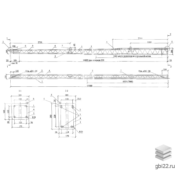 Изделие представляет собой трапециевидную балку с сужением на одном торце. На боковых гранях расположены отверстия ?24–28 мм. Производится из бетона класса В30 (М400) с армированием стальными стержнями и спиралями.