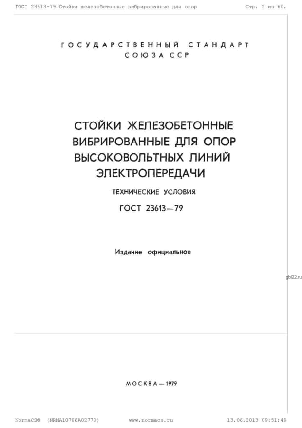 | Название стандарта | Стойки железобетонные вибрированные для опор высоковольтных линий электропередачи. Технические условия. |