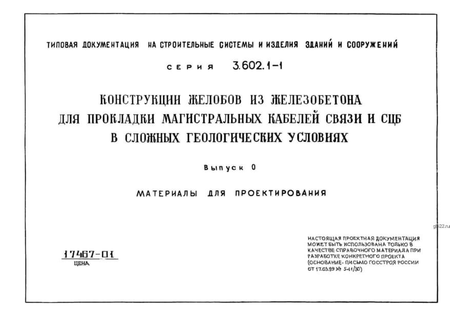 | Название стандарта | Конструкции желобов из железобетона для прокладки магистральных кабелей связи и СЦБ в сложных геологических условиях. |