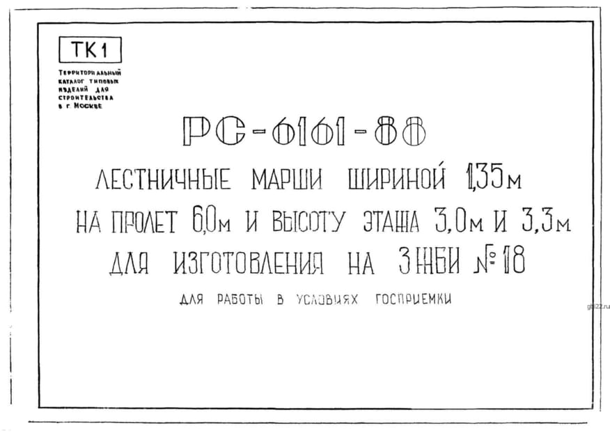 Завод ЖБИ № 18 производит лестничные марши РС 6161-88 шириной 1,35 м для пролетов 6,0 м и высоты этажа 3,0 м и 3,3 м. Изделия соответствуют строгим требованиям госприемки, обеспечивая прочность, долговечность и безопасность. Преимущества: