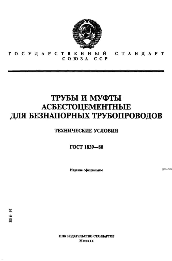 Стандарт ГОСТ 1839-80 регламентирует технические условия для асбестоцементных труб и муфт, предназначенных для безнапорных трубопроводов. Эти изделия применяются в системах канализации, дренажа, мелиорации и других коммуникациях, где не требуется высокое давление. Ключевые особенности: