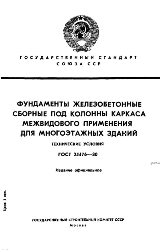 | Название стандарта | Фундаменты железобетонные сборные под колонны каркаса межвидового применения для многоэтажных зданий. Технические условия. |