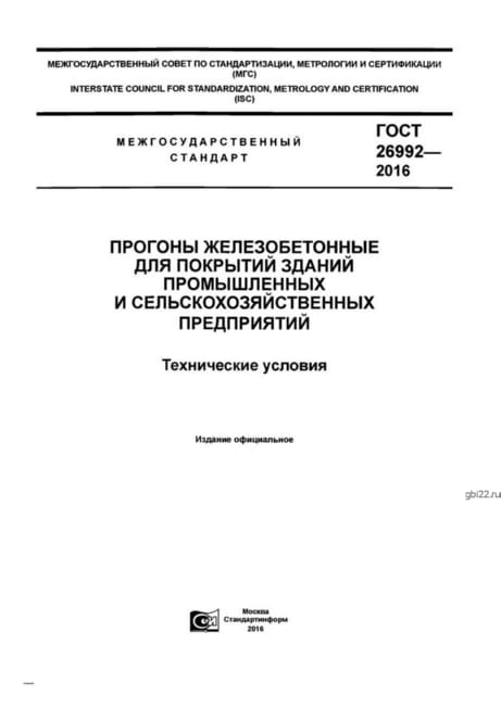 ГОСТ 26992-2016: Прогоны железобетонные для промышленных и сельскохозяйственных зданий Стандарт ГОСТ 26992-2016 устанавливает технические требования к железобетонным прогонам, используемым в покрытиях промышленных и сельскохозяйственных зданий. Документ регламентирует: - Классы бетона (прочность, морозостойкость, водонепроницаемость). - Армирование (типы сталей, защитный слой). - Геометрические параметры (размеры, допуски). - Методы испытаний (нагрузочные, визуальный контроль). Прогоны соответствуют нормам безопасности и долговечности, обеспечивая надежность каркасных конструкций. Применяются в ангарах, складах, фермах и других объектах с повышенными нагрузками. Актуальная редакция стандарта учитывает современные строительные технологии, что делает его ключевым документом для производителей и проектировщиков.