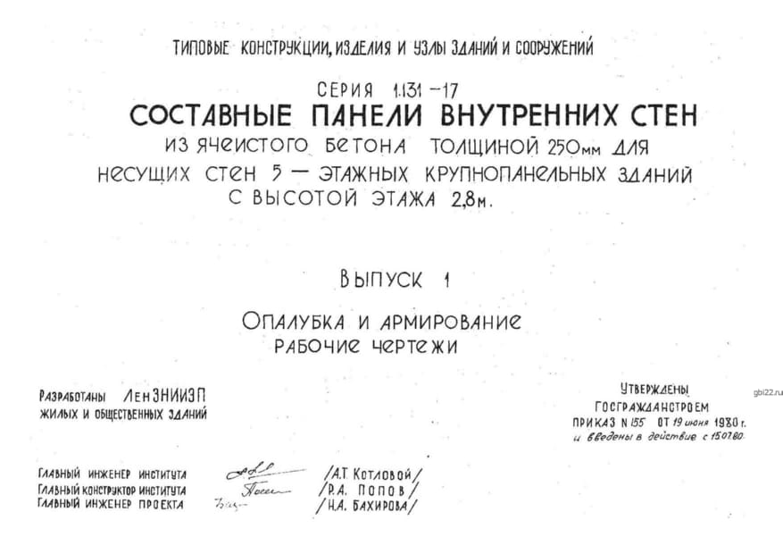 | Название стандарта | Составные панели внутренних стен из ячеистого бетона толщиной 250 мм для несущих стен 5-этажных крупнопанельных зданий с высотой этажа 2,8м. |