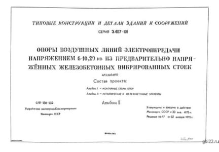 Серия 3.407-101: надежные опоры ЛЭП 6–20 кВ из предварительно напряженного железобетона Опоры воздушных линий электропередачи серии 3.407-101 предназначены для напряжений 6–10 кВ и 20 кВ. Изготовлены из предварительно напряженных железобетонных вибрированных стоек, что обеспечивает высокую прочность, устойчивость к нагрузкам и долговечность. Преимущества: