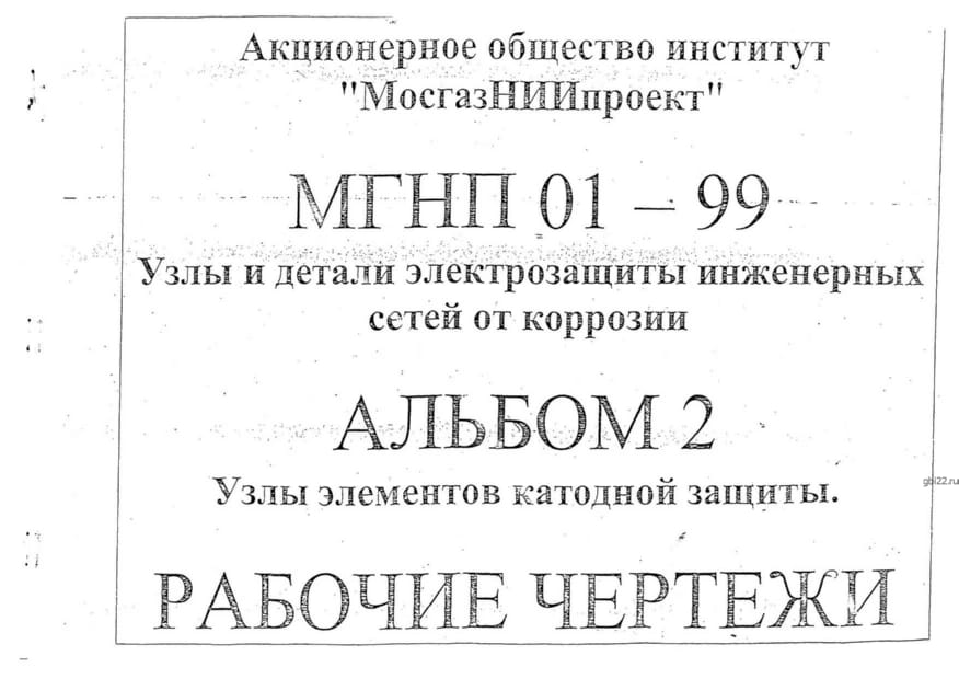 Серия МГНП 01-99 включает типовые решения для защиты подземных коммуникаций от электрохимической коррозии. В документации представлены узлы и детали катодной, дренажной и протекторной защиты трубопроводов, кабелей и других инженерных сетей.
